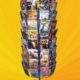 Drehbares Präsentationsdisplay für Postkarten mit einer atypisch gelösten Platzierung der Taschen.Das Display ist fahrbar, mit 5 Rollen, 2 davon sind mit Bremse.